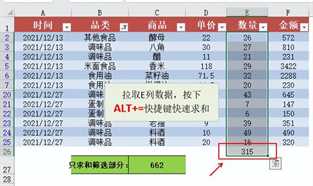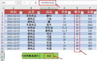 最佳答案点击筛选按钮,可以看到其中”乳制品“没有勾选,因此筛选后没有显示乳制品类下的数据。我们的任务,首先是求和筛选后的商品的数量总和。如果输入大家常用的求和函数公式:=SUM(E2:E25)得出的结果却是”662“,这个结果显然是错误的。那么我们可以直接拉取E2:E26单元格区域,这里E26单元格作为求和......
