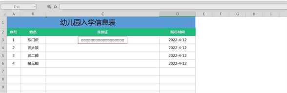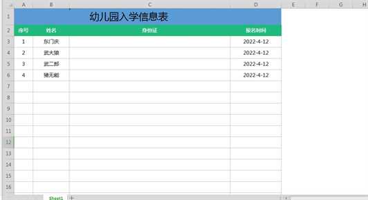 首先打开excel文档,下面是一个幼儿园入学信息表格,需要填写身份证信息,需要显示打印出填写身份证号的小方格。