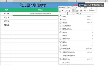 2、这时就出现了想要的填写身份证号的小方格了,有时小方格比较小,可以通过选择单元格“右键”-调节字号大小来设置成合适尺寸