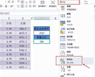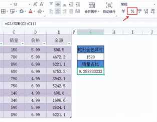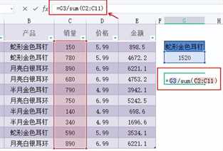 用“蛇形金色耳钉”的总销量除以所有产品的总销量,就得到了该耳钉在总销量中的占比。