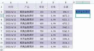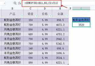 那么首先我们需要计算出”蛇形金色耳钉“的总销量,这个属于条件求和,使用sumif函数便可以轻松搞定。