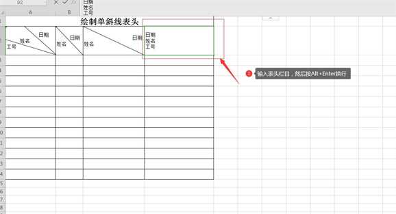 2、然后分别输入,“日期”,“姓名”,“工号”,这三个换行是按Alt+Enter,如下图: