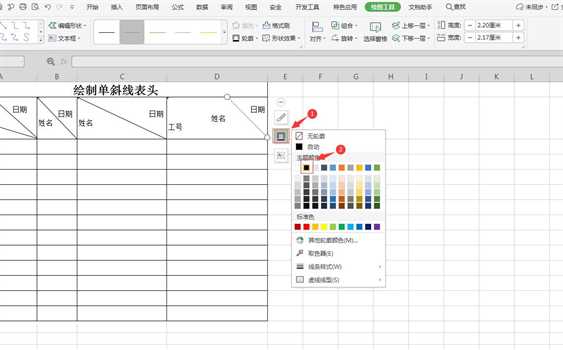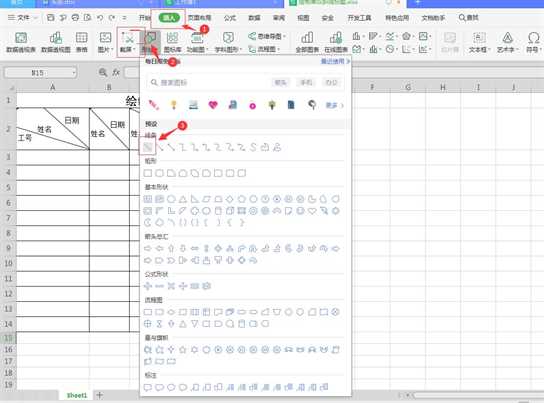 4、选择“插入”-“形状”-选择直线,在表头绘制一条斜直线,然后设置直线颜色为黑色,如下图