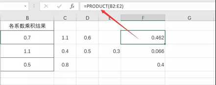 最后在单元格中输入公式=PRODUCT(B2:E2)即可获取结果。