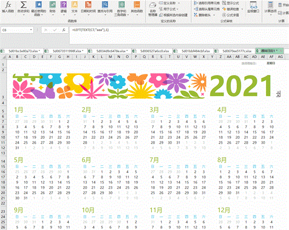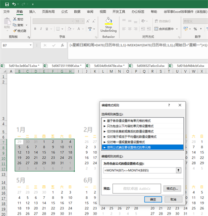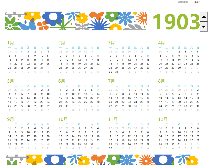 日期公式:{=星期日期和周+DATE(日历年份,1,1)-WEEKDAY(DATE(日历年份,1,1),(周始日=“星期一”)+1)+1}