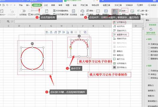 7、选中印章文字,按Ctrl键,点击已经制作好的圆形,点击“页面布局”-“对齐”-分别选择“水平居中”和垂直居中-最后“组合”