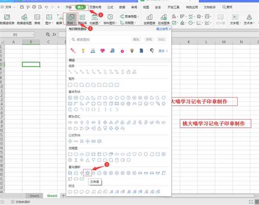 1、通过“插入”-“形状”-“星与旗帜”中的五角星,绘制五角星
