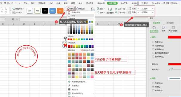 2、绘制的五角星填充和轮廓都设置为红色,高度和宽度都设置成1厘米
