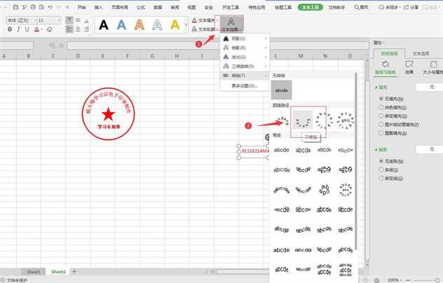 3、为印章编号设置文字效果,“文本工具”-“文字效果“-“转换”-“跟随路径”-下弯弧,最后放到合适的位置。