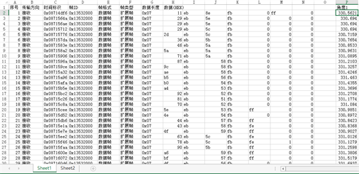 这里说明一下,如果接收到的数据帧ID有很多种,需要先使用“排序和筛选”功能,只显示需要分析的帧ID。示例的数据帧ID为0x13532000,每帧的数据长度为7个字节,其中第0个、第1个字节为角度1,第2个、第3个字节为角度2。角度的单位为度,范围为0~360°,比例系数为360/65536。
