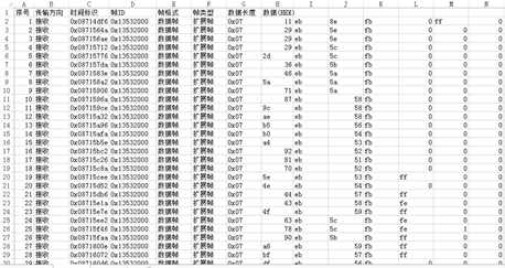 这里以周立功CAN盒收到的一组数据为例,说明具体操作过程。首先把CAN盒接收到的数据保存为csv格式,用Excel或Wps打开(二者操作基本差不多,下文都只写作为Excel)。