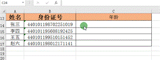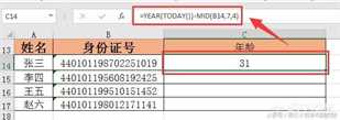 具体操作步骤:在C14单元格中输入公式 “=YEAR(TODAY())-MID(B14,7,4)”。