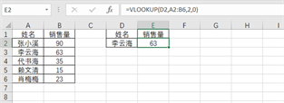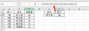 若想通过姓名查找对应的部门,还想用VLOOKUP函数查找,这时要输入公式=VLOOKUP(E2,IF({1,0},B2:B6,A2:A6),2,0)