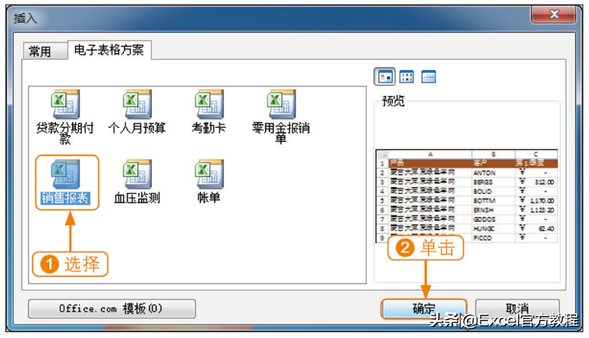 ①打开“插入”对话框,在“电子表格方案”选项卡下选择需要插入的模板类型,如“销售报表”;