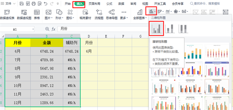 3、选中月份和金额以及辅助列所在区域,然后点击【插入】——【插入柱状图】——【簇状柱形图】;