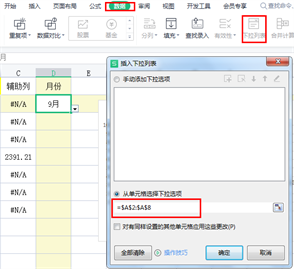 7、此时想设置图标为动态,只需要在D2单元格设置下拉菜单。首先将光标定位D2单元格,点击【数据】——【下拉列表】——来源设置月份所在的区域,点击确定即可;