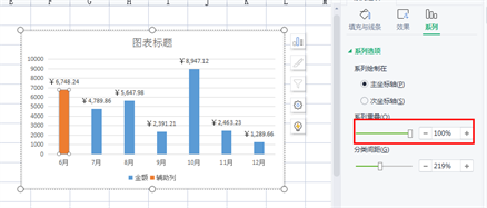 6、选中唯一橘色辅助列的柱形图,鼠标右键,将【系列重叠】设置为【100%】,按回车键即可;