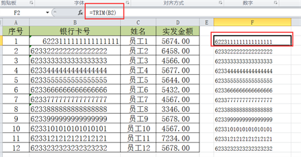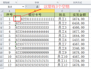以下表为例,为了明显起见,在银行卡号一列的单元格B2最左边添加了3个空格。Excel怎么快速去掉潜在的空格隐患呢?一步就够了。