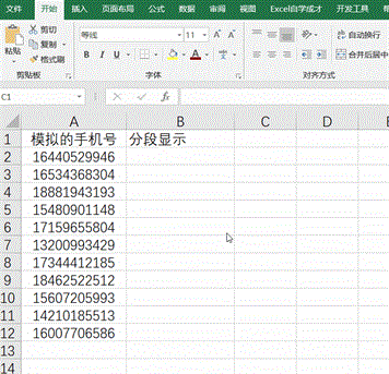 这个方法对于Excel的版本有要求,必须是2013及以上版权,我们首先手动输入一个手机号,然后在下方按快捷键CTRL+E,它就能直接快速的进行填充完成,操作动图如下所示: