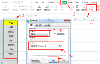 操作方法:首先选中需要设置的A列——【数据】选项表——【有效性】,在弹出的数据有效性小窗口中【有效性条件】选择【自定义】,输入公式【=COUNTIFS(A:A,A1)<=1】,最后【确定】(附:此公式是对A列执行计数,当计数小于等于1时,才会被输入。)