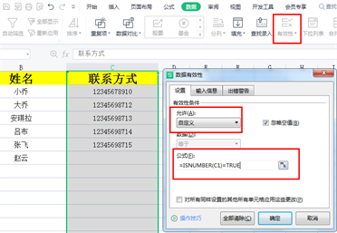操作方法:依然是在【数据有效性】小窗口中设置,选择【自定义】,输入公式:=ISNUMBER(C1)=TRUE.