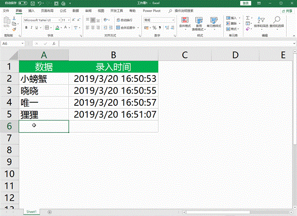 如下效果图,需要在A列录入数据,然后B列显示录入数据的时间。