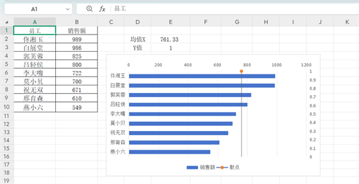 由于Excel默认情况下没有竖向折线图,所以均值线需要借助散点图来制作。散点图的X值取数值列的平均值,这样就能确定均值线的横向位置;Y值可以随便输入一个数值,比如1,之后可以通过设置次要垂直轴来调整它的位置。