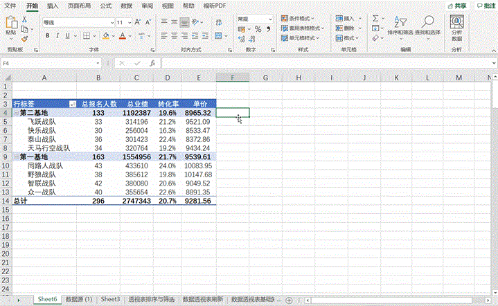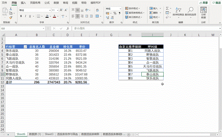 目的1:将数据透视表中的字段按照团队业绩等进行排序