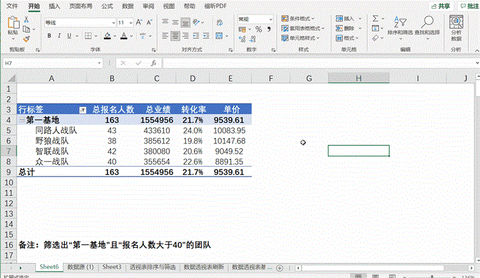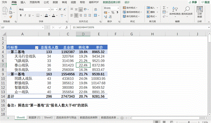 目的2:在数据透视表中筛选出“第一基地”且“报名人数大于40”的团队