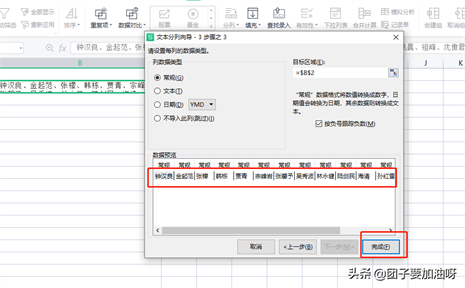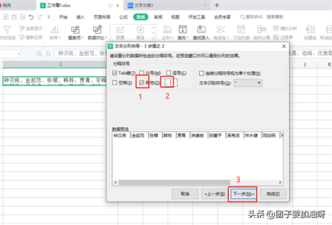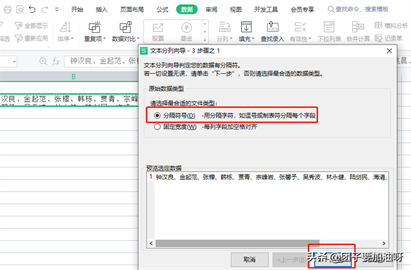 第三步:由于姓名字数都不是固定的个数,所以选择分隔符号,我们可以看出每个姓名都是用、号隔开的,有的情况也使用空格号或者其他符号隔开,点击下一步