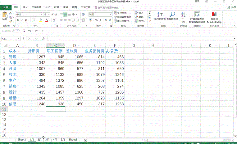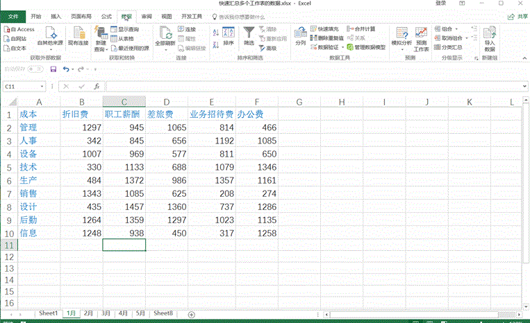 如在下图中所示的情况,我们需要将1月-5月份共5个工作表的数据进行合并,合并成一个新的工作表。请看具体操作。