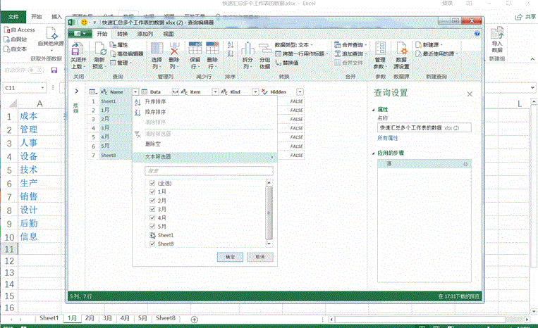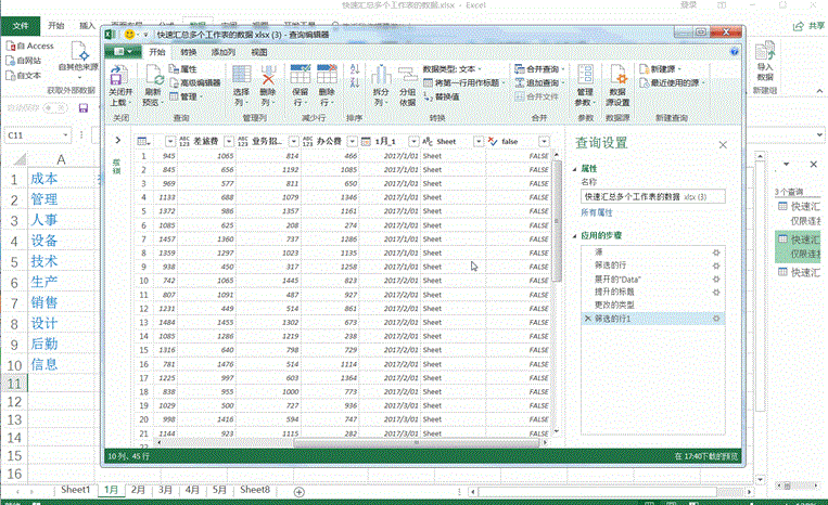 但是因为每个工作表都有一行标题,所以标题也被合并进去了,这时候选择开始选项卡下的“将第一行用作标题” ,然后筛选成本这一列,将“成本”取消勾选