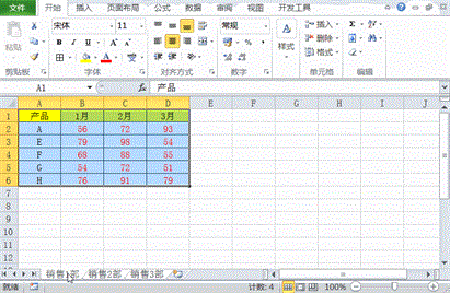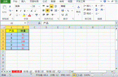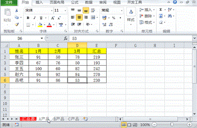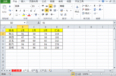 案例说明:我们需要将每个人A、B、C三种产品表格中的数据进行求和操作。