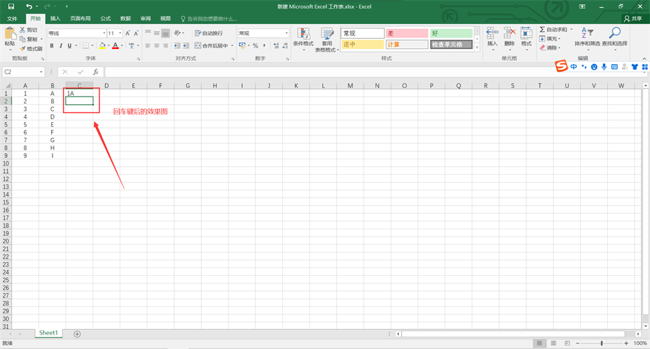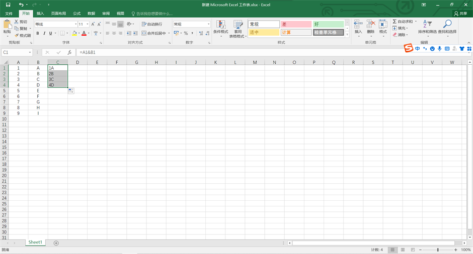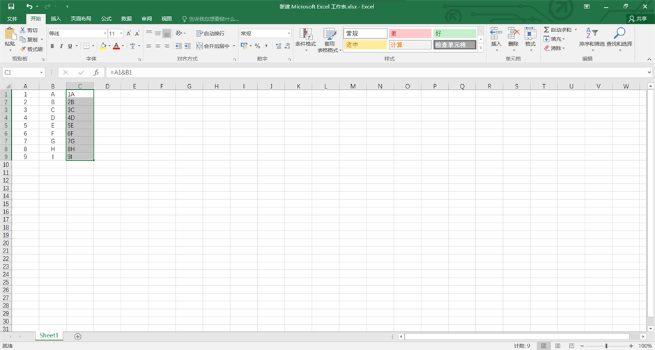 第三步、输入公式以后直接点击“回车键”,此时选择框会自动跳到下一个单元格,而在C1单元格则出现A1和B1合并的内容。