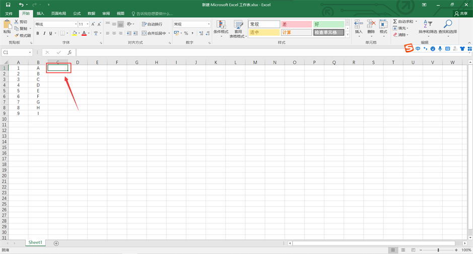第一步、如下图,把A列和B列的数据合并到C列。首先鼠标单击选择C1单元格,使其处于输入状态。