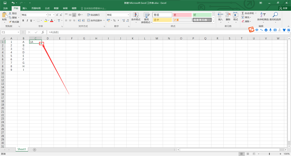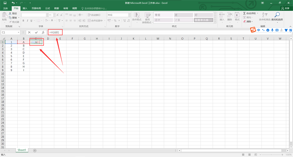 第二步、在单元格输入公式,先输入等于号,然后用鼠标点击A1,接着输入符号&,最后在点击B1。