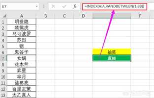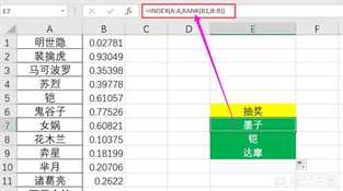 然后我们在中奖名单里面输入公式:=index(a:a,rank(b1,b:b)),希望几个人中奖的话,就向下拉动几个单元格,便可以得到不重复的多人中奖抽奖模式