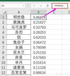 我们需要在第2列中输入公式=rand()函数,然后向下填充,它会随机的生成0-1之间的随机数