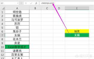 因为在代码中,我们是对D1单元格产生随机数,所以在表格中,输入的公式是:=index(a:a,d1)