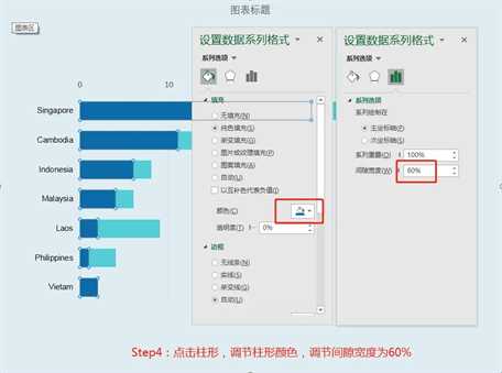 设置图表颜色,点击一列的条形就可以对整个列条形统一修改颜色,同时修改间隙宽度为60%,最后添加文字说明就大功告成了