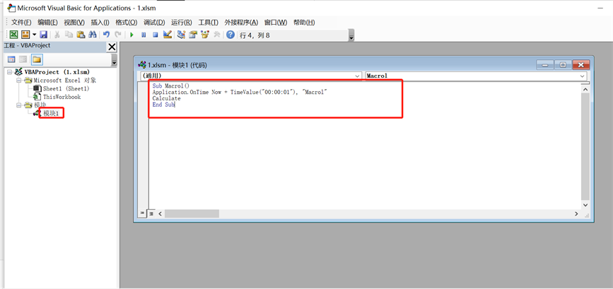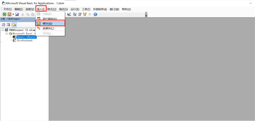 左侧【工程栏】中,双击刚插入的【模块1】,然后在右侧的代码窗口输入以下代码: