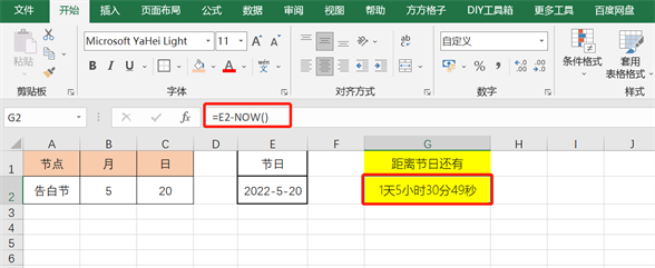 第二步:在空白单元格输入公式【=E2-now()】(这里的E2是指节日所在的单元格,now()是指现在的时间,两者相减就可以得到剩余的时间)