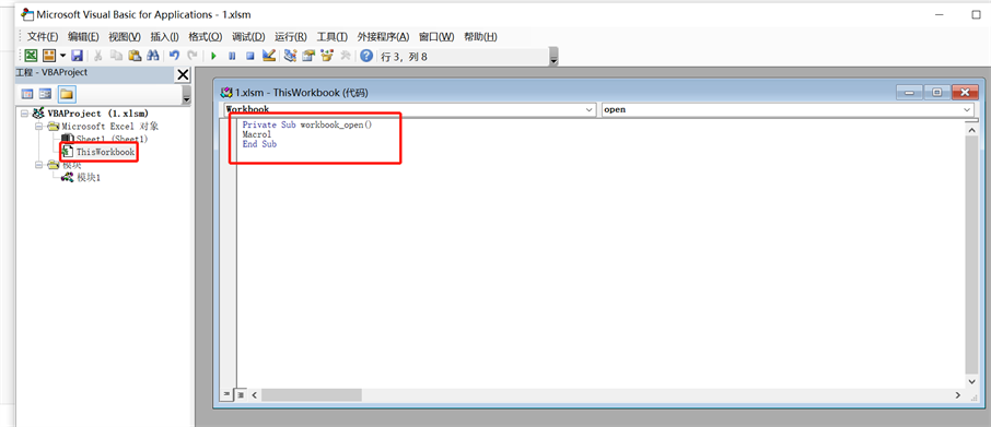 然后双击【工程栏】中的【ThisWorkbook】,在右侧的代码窗口输入以下代码: