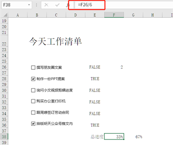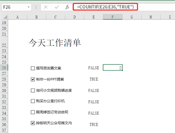 这个函数的含义在于,统计E26单元格到E36单元格这一列当中,显示为TRUE的一共有多少个。也就是统计完成的项目有几个。