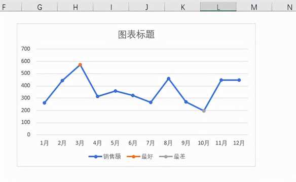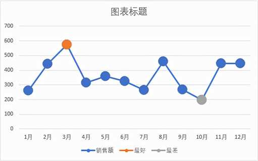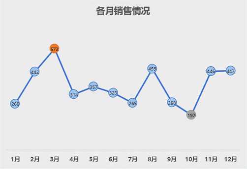 我们从上面的图表中不仅可以看到各月的销售情况,而且可以看出橙色的是销售额最好的月,灰色的是销售额最差的月。