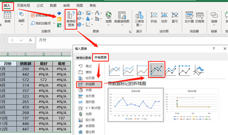 接下来选中B2:E14单元格区域,选择插入-推荐的图表-所有图表-折线图-带数据标记的折线图: