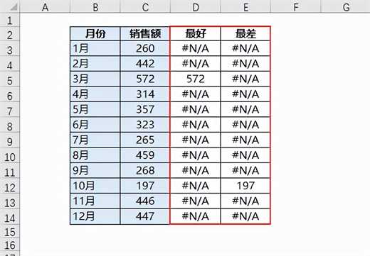 红色方框中的数据是增加的辅助列,可以用公式来实现,D3单元格输入=IF(C3=MAX($C$3:$C$14),MAX($C$3:$C$14),NA()),然后向下复制,E3单元格输入=IF(C3=MIN($C$3:$C$14),MIN($C$3:$C$14),NA()),然后向下复制。