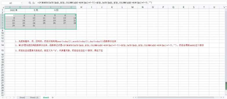 最佳答案一、第一行先弄好年月日,分别用year(today())、month(today())、day(today())函数表达出来,如下图所示 二、然后空一行,在第三行用函数把日表示出来,会得到44682这样的数字=IF(MONTH(DATE($A$1,$C$1,COLUMN(A$8)+ROW(......