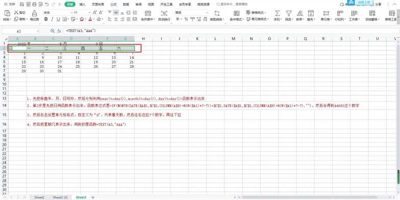 四、这时候在第二行用函数text(a3,”AAA”)表达星期几