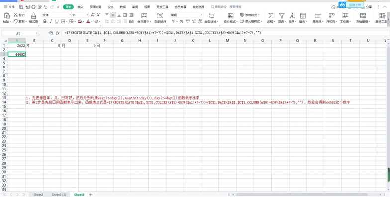 二、然后空一行,在第三行用函数把日表示出来,会得到44682这样的数字
